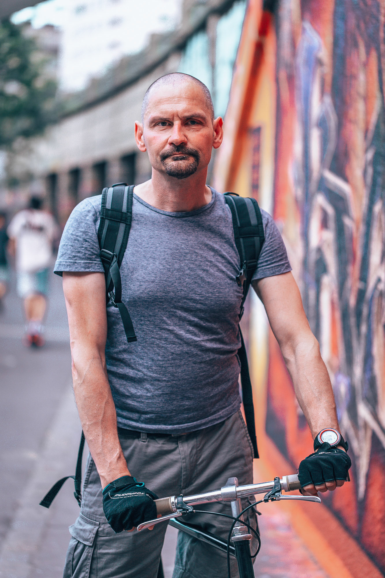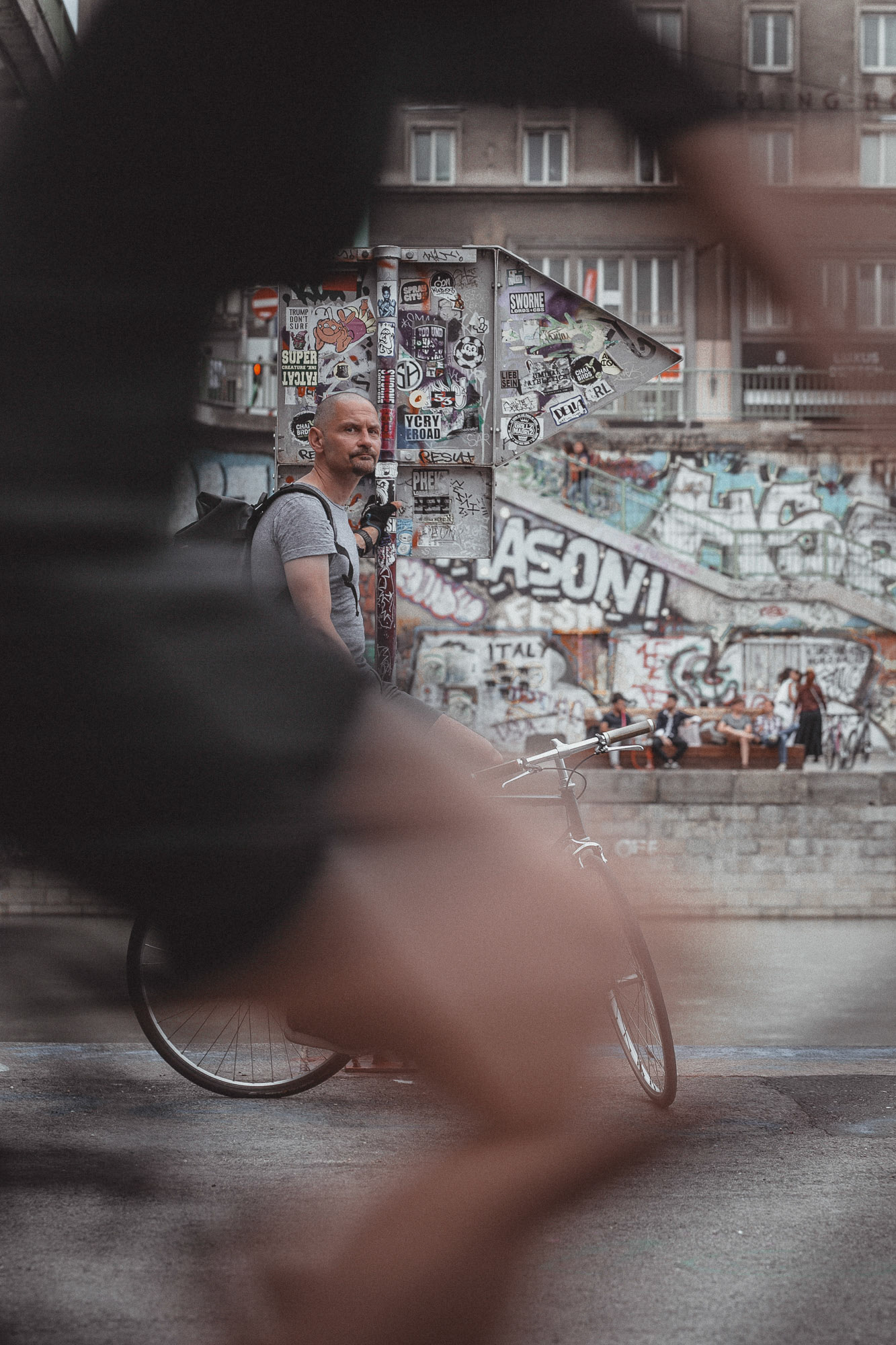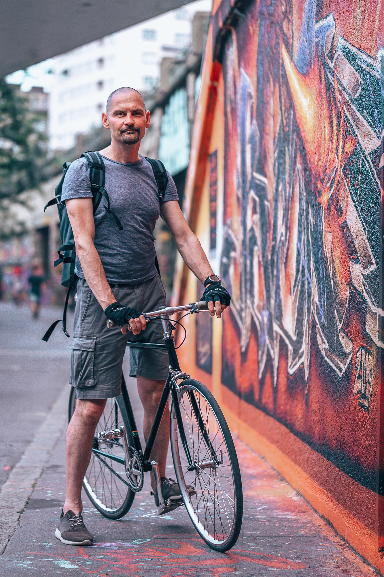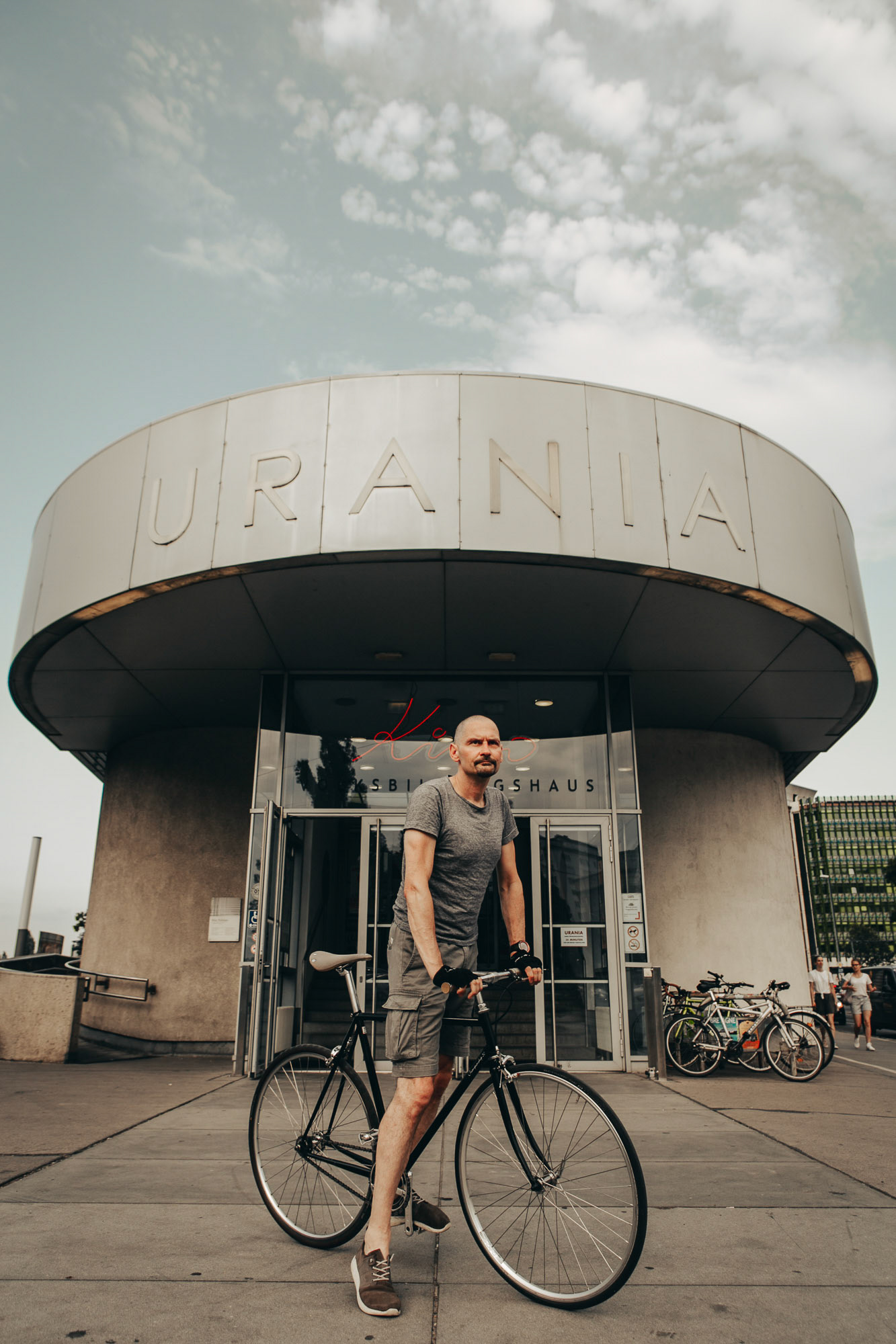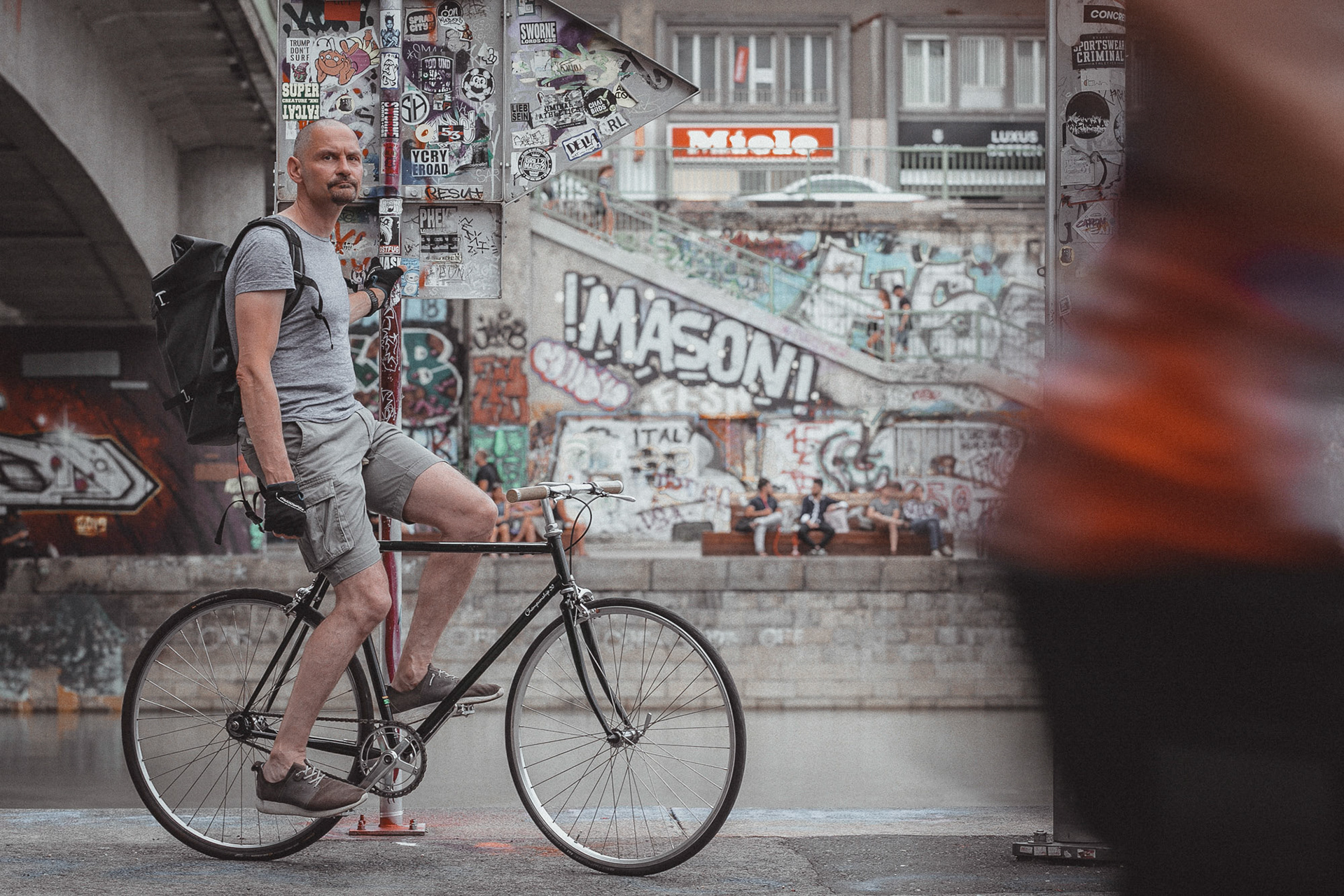 Christian fährt mit seinem Single-Speed-Bike das ganze Jahr durch Wien. Daher lag nichts näher, als ihn mit und auf seinem Fahrrad zu porträtieren. Dafür waren wir am Donaukanal unterwegs.